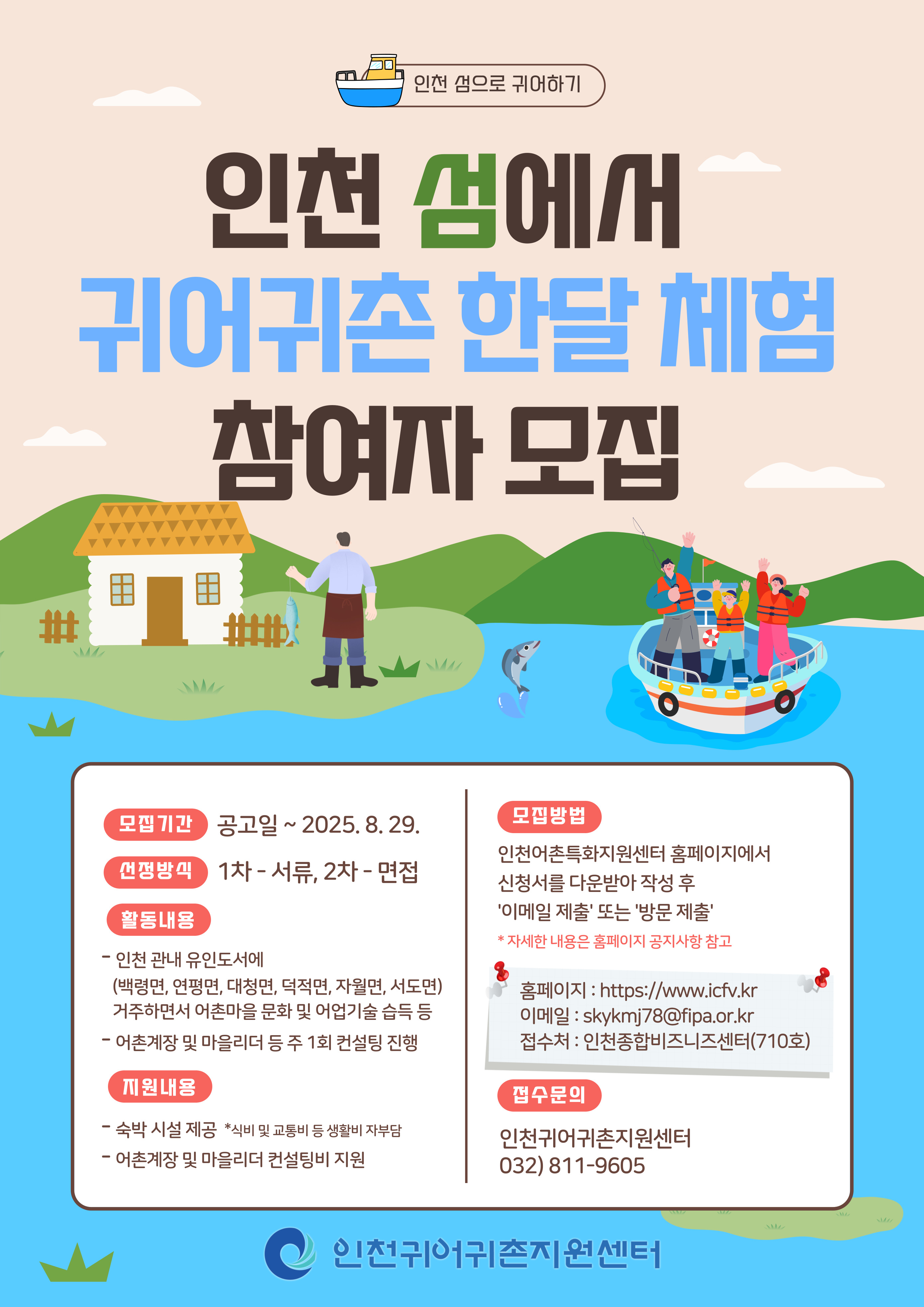 2025년 인천 도시민어촌유치지원사업 중「인천 섬으로 귀어하기 프로그램」의 참여자 모집을 다음과 같이 공고 하오니, 많은 관심과 참여 부탁드립니다.